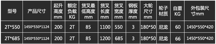 搬運車分為兩種型號:550型和685型,其具體的相關(guān)尺寸見上圖所示。其輪子也分為2種,一種是尼龍輪,一種是橡膠輪。尼龍輪適合水泥地面,橡膠輪適合大理石、油漆、環(huán)氧地面。